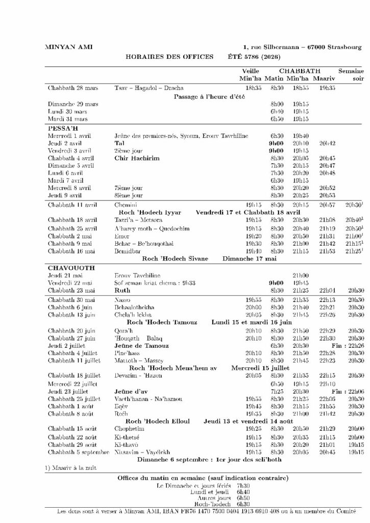 HORAIRES PESSAH ET ÉTÉ 5786